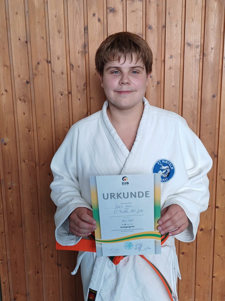 Mit der Prüfung zum orange-grünen Gürtel absolvierte Jakob Haas die letzte Prüfung, die auf Vereinsebene möglich ist. Höhere Graduierungen erfolgen auf Kreis- oder Bezirksebene und nach Teilnahme an vorbereitenden Lehrgängen.